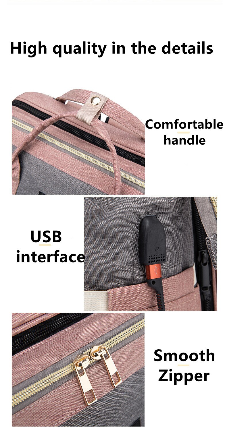 The backpack is equipped with a USB charging port, enabling you to conveniently charge your devices while you're out and about. Whether it's your smartphone or tablet, you can stay connected and never miss an important call or message. The stroller hanging pocket offers a convenient storage solution, allowing you to easily attach the bag to your stroller and keep your hands free.